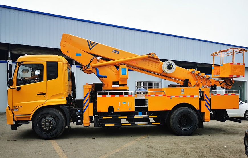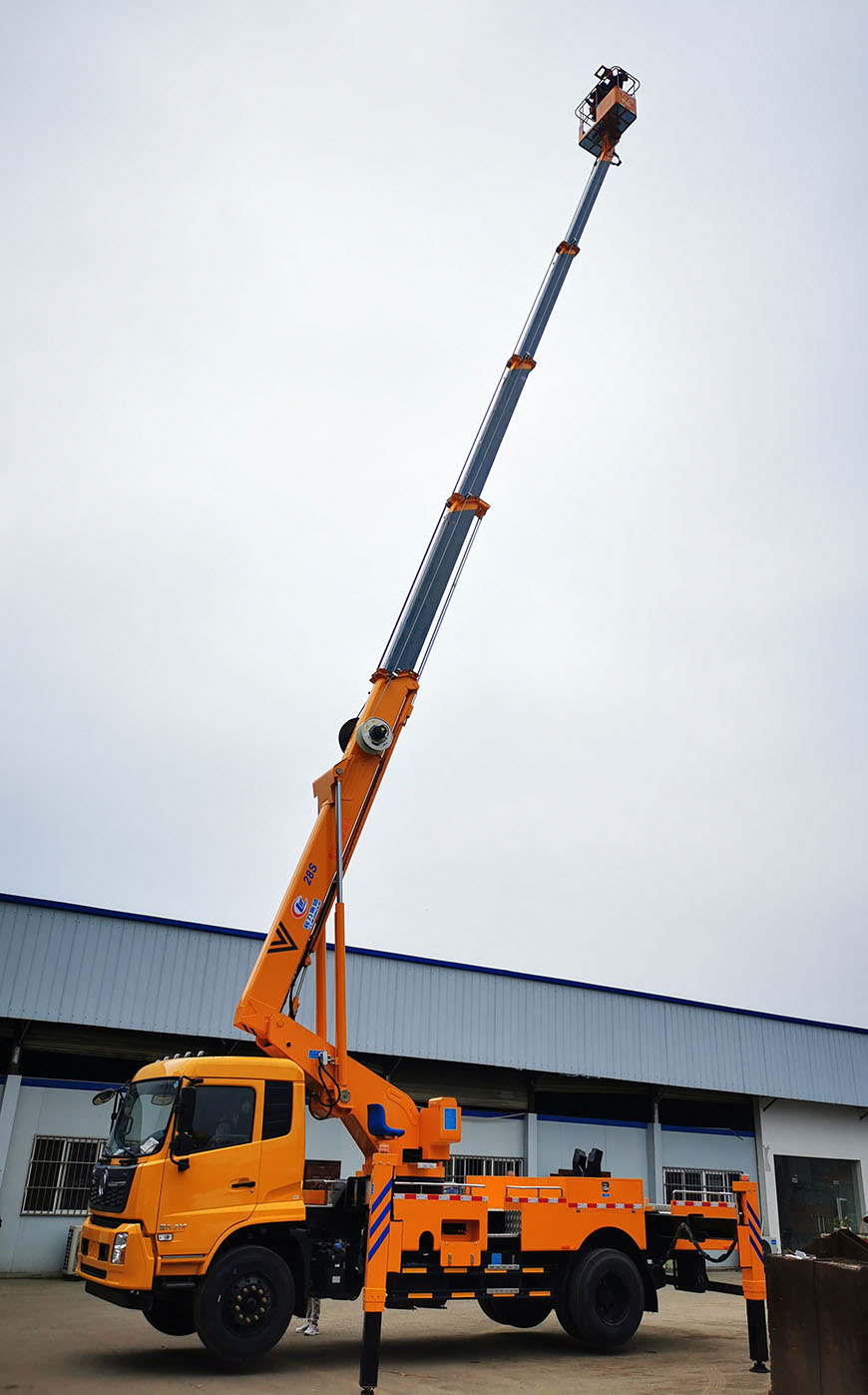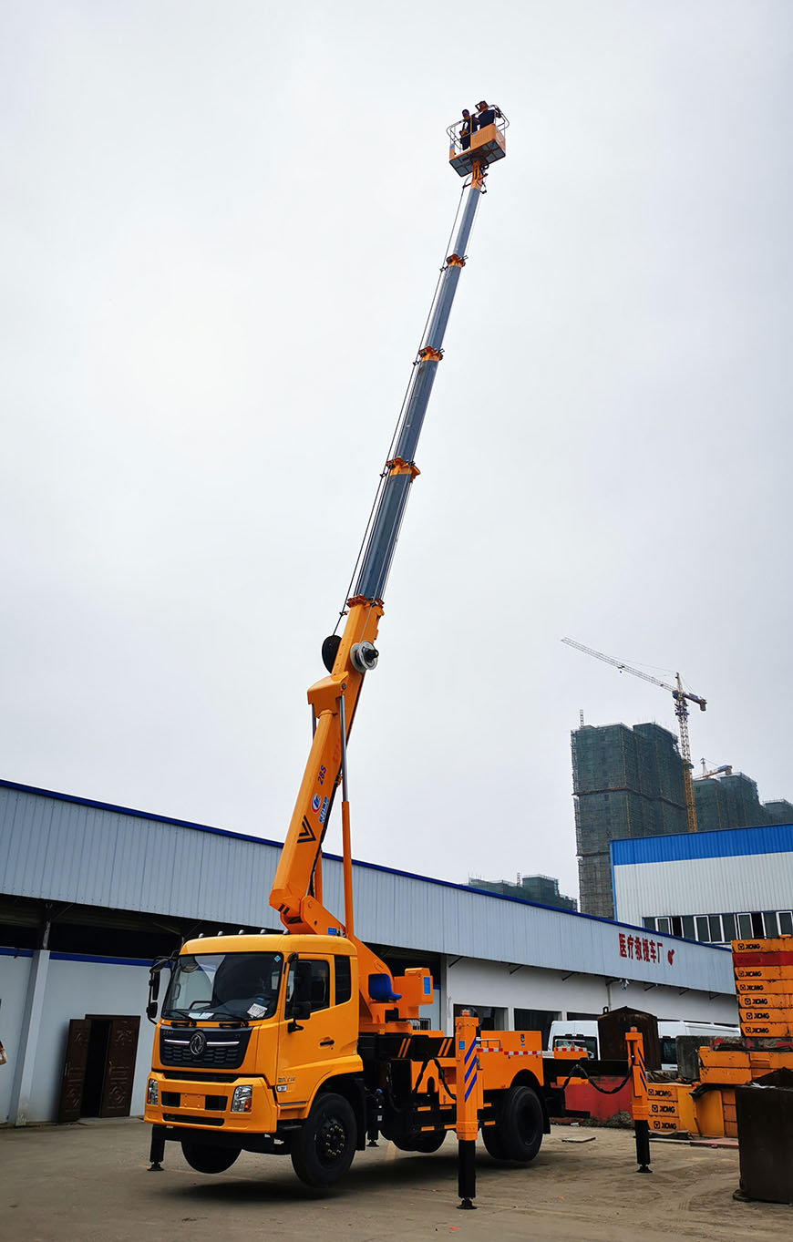 国六黄牌32米高空作业车,东风天锦底盘,排半带卧驾驶室,康明斯6缸210马力发动机,作业幅度15.6米,作业高度28米,作业高度时的作业幅度 6.1米,360°全回转,前V后H型支腿,支腿横向跨距5370/5385(mm),支腿纵向跨距4975/5195(mm)。吊篮额定载荷≯200kg,吊篮尺寸1200×700×1150mm,带油缸锁止功能,车架和吊篮双位操作,带应急动力单元,转台加装座椅,带无线遥控!